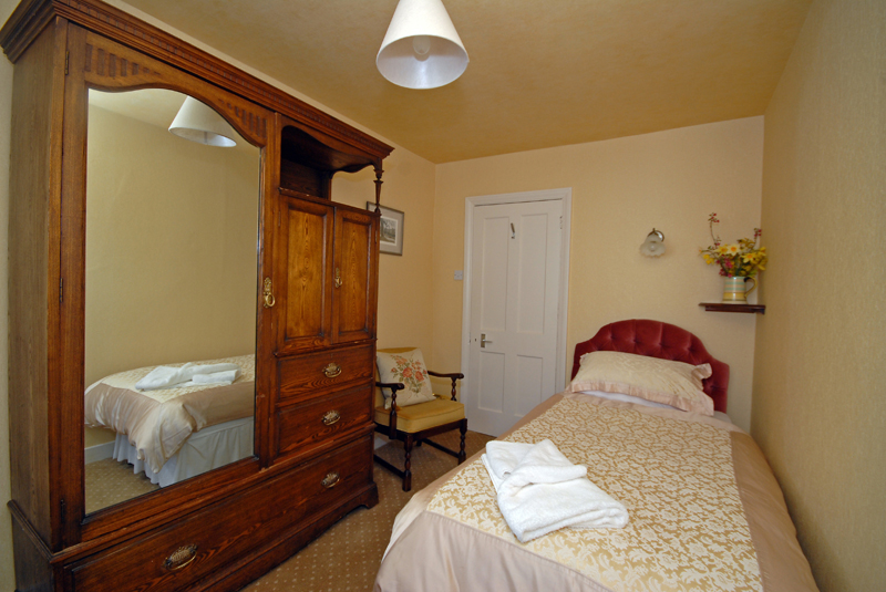 Upstairs are a twin bedded room and a double bedded room, both with large windows on two sides giving extensive views of the valley and both with private bathrooms. The garden is secluded with a delightful little patio.