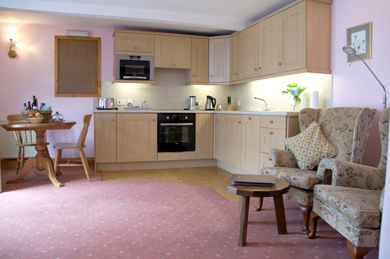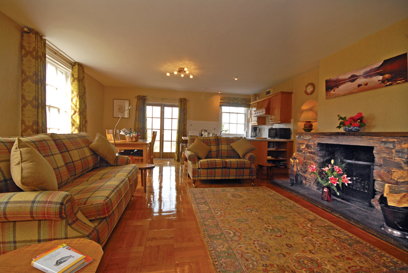 A spacious room, with two walls of the attractive original stonework showing, it contains a comfortable living area furnished to a high standard with a modern kitchen/dining area in one corner.